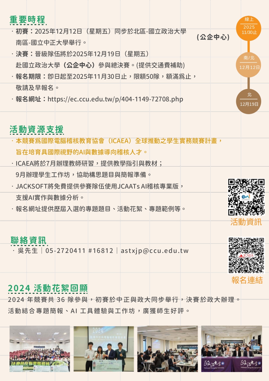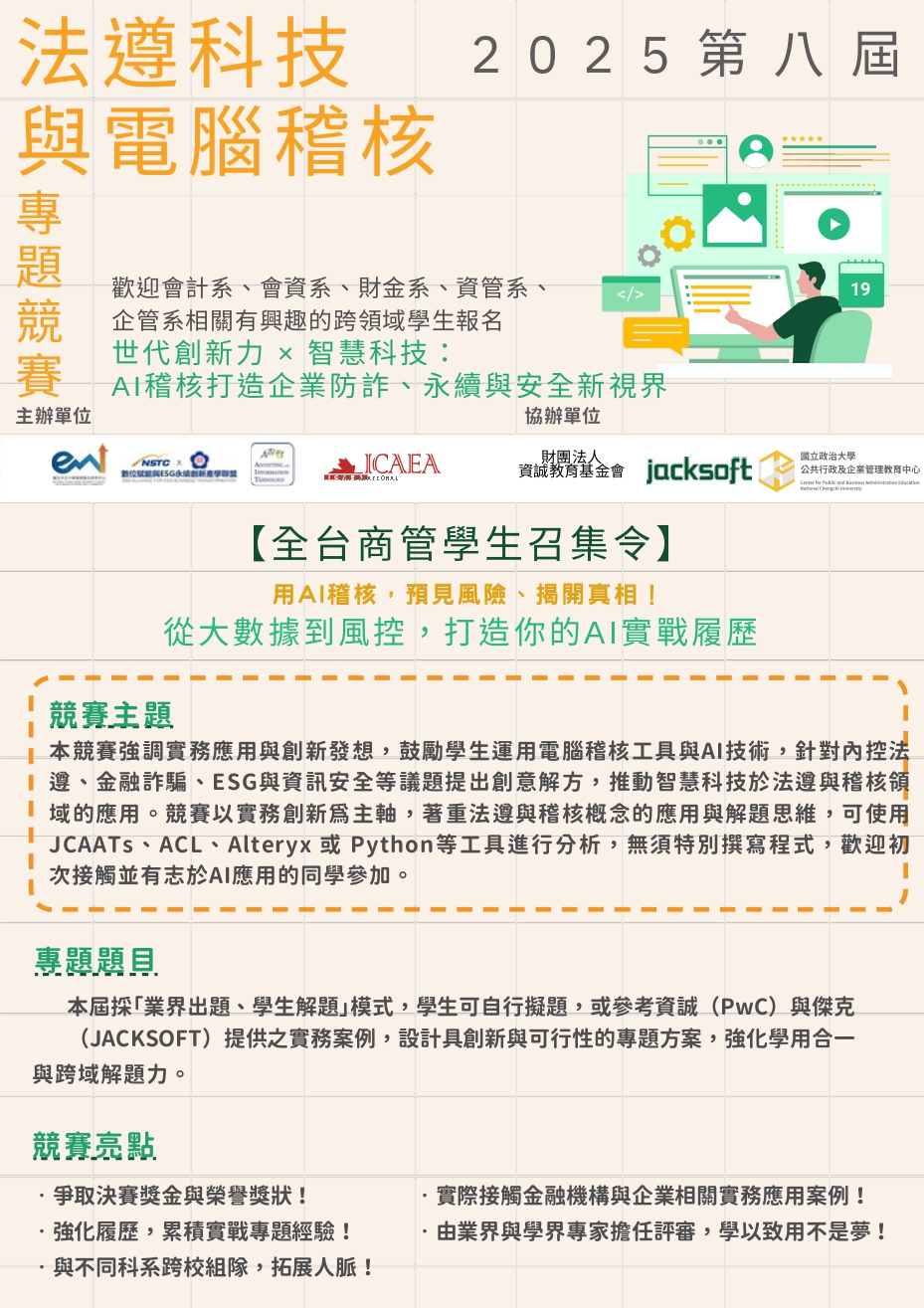 本競賽為國際電腦稽核教育協會(ICAEA)全球推動之學生實務競賽計畫,旨在培育具國際視野的AI與數據導向稽核人才。